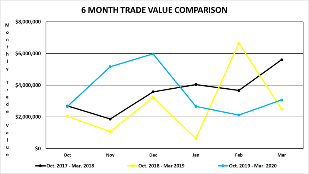 For the three-month period from January 2, 2020 to March 31, 2020, the average volume per trading day was 22,948 shares for a value of $124,226.24. By comparison, for the three-month period from January 2, 2019 to March 31, 2019, the average volume per trading day was 37,333 shares for a value of $160,205.75.