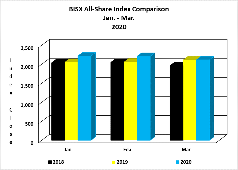 For the three-month period ending March 31, 2020 the BISX All-Share Index closed at 2,117.17. This represents a year to date decrease of 114.33 or 5.13%. By comparison for the three-month period ending March 29, 2019 the BISX All-Share Index closed at 2,119.29. That was a year to date increase of 9.88 or 0.47%. The BISX All-Share Index is a market capitalization weighted index comprised of all primary market listings excluding debt securities.