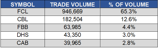 The top five share volume leaders on BISX for the three-month period January 2, 2020 to March 31, 2020 with their contribution to total traded volume displayed as a percentage were: