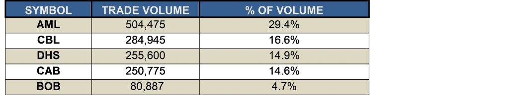 SHARE VOLUME AND VALUE LEADERS (TWELVE MONTH PERIOD)The top five share volume leaders on BISX for the twelve-month period January 1, 2017 to December 29, 2017 with their contribution to total traded volume displayed as a percentage were: