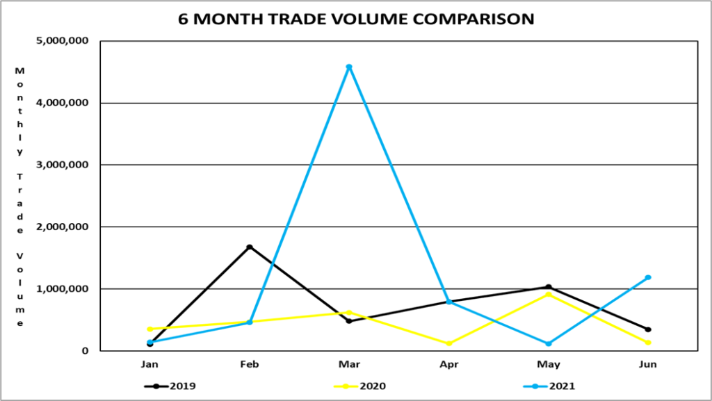 Trading volume for the six-month period January 2, 2021, to June 30, 2021, was 7,295,041 shares for a value of $36,538,928.35. Trading volume for the six-month period January 2, 2020, to June 30, 2020, was 2,624,048 shares for a value of $11,622,255.68.
