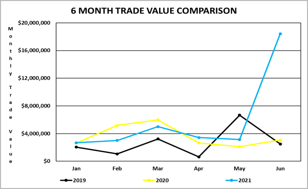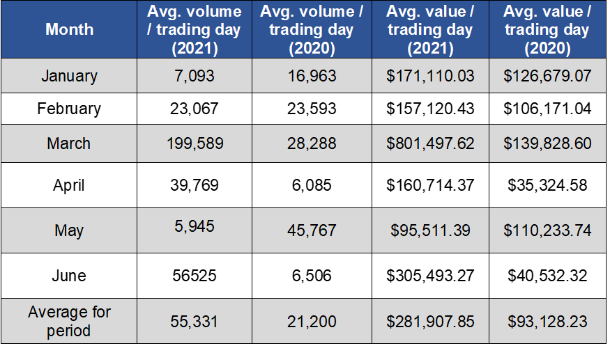 For the six-month period from January 2, 2021 to June 30, 2021, the average volume per trading day was 55,331 shares for a value of $281,907.85. By comparison, for the six-month period from January 2, 2020 to June 30, 2020, the average volume per trading day was 21,200 shares for a value of $93,128.23.