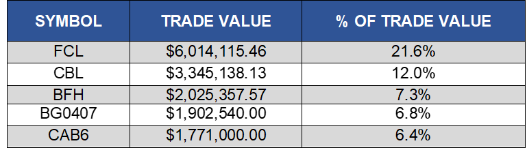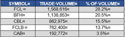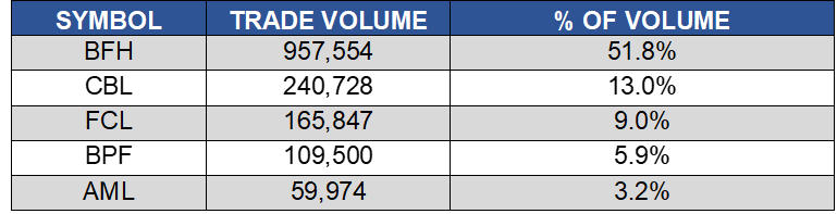 The top five share volume leaders on BISX for the three-month period October 1, 2020 to December 31, 2020 with their contribution to total traded volume displayed as a percentage were: