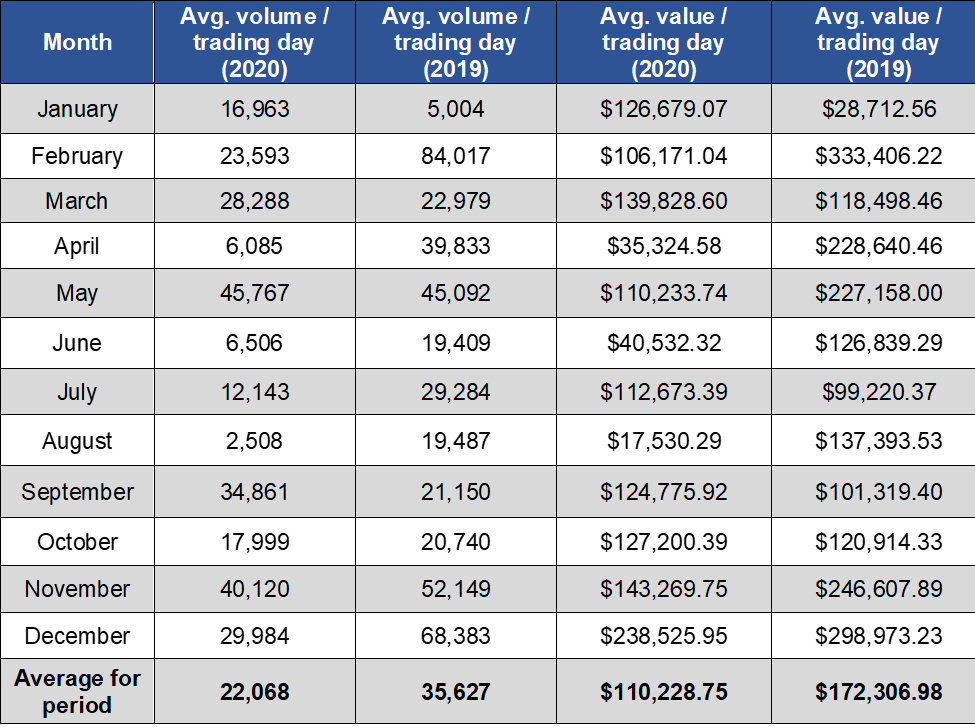 During the three-month period from October 1, 2020 to December 31, 2020, the average volume per trading day was 29,368 shares for a value of $169,665.37. By comparison, for the three-month period from October 1, 2019 to December 31, 2019, the average volume per trading day was 47,091 shares for an average value of $222,165.15.