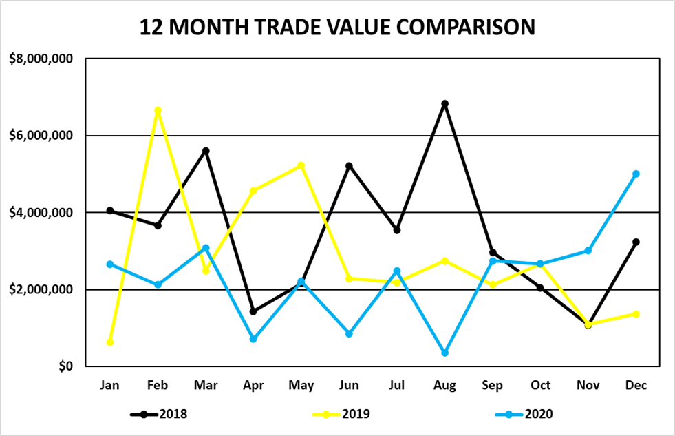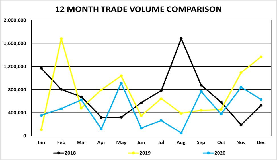 Trading volume for the three-month period October 1 to December 31, 2020 was 1,850,180 shares for a value of $10,688,918. By comparison, for the three-month period from October 1 to December 31, 2019 was 2,919,089 shares for a value of $13,818,345.31.