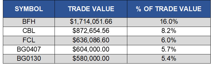 As at December 31, 2020 the market was comprised of 20 ordinary shares with a market capitalization of $4.51 Billion. In addition, there were 7 preference shares with a market capitalization of $244 Million, 10 BGS and corporate bonds with a face value of $479 Million, and 210 BRS with a face value of $3.5 billion.